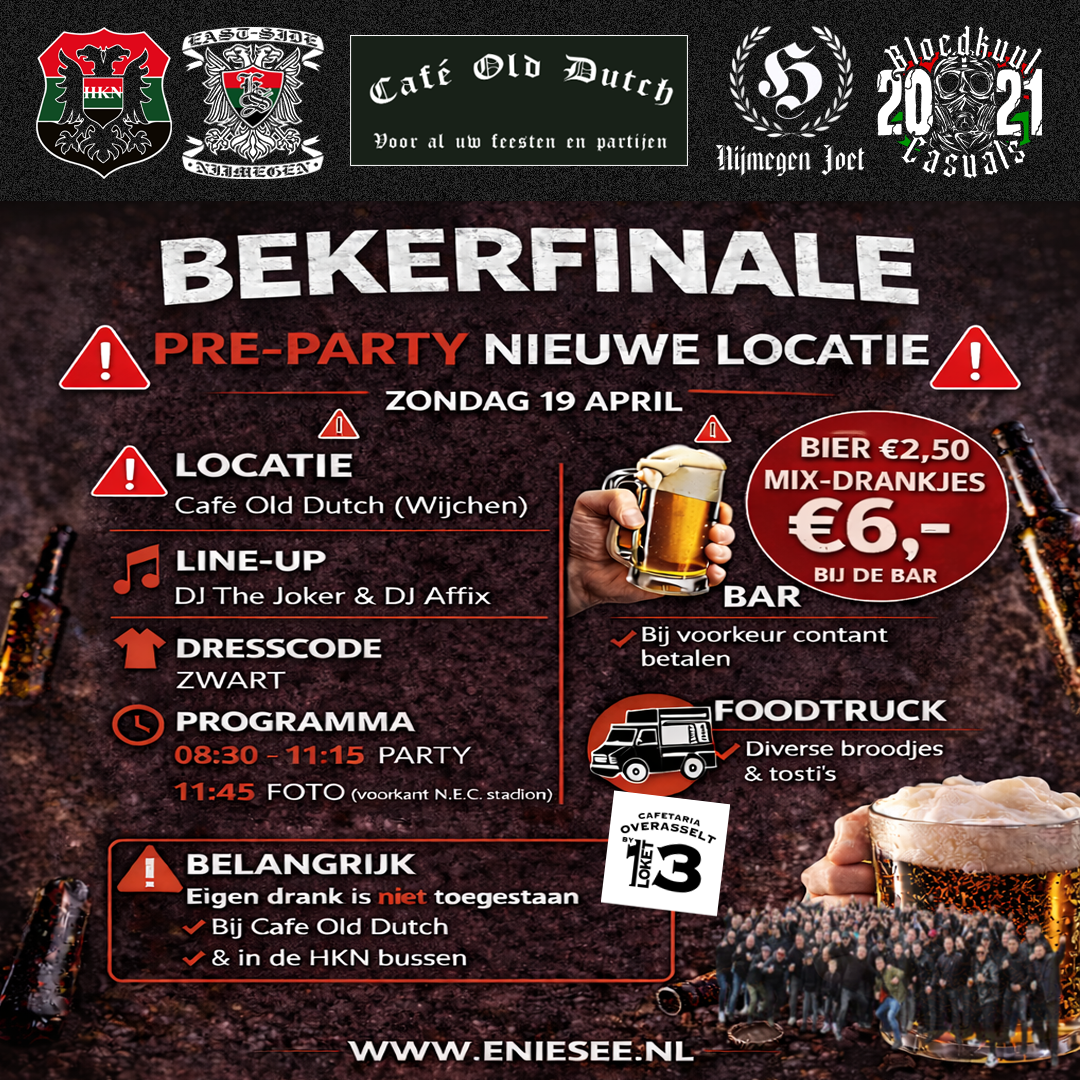 BEKERFINALE PRE-PARTY 🔺 NIEUWE LOCATIE 🔺 CAFÉ OLD DUTCH (WIJCHEN) door HKN / East Side | apr 15, 2026 | Finale beker, Supporters